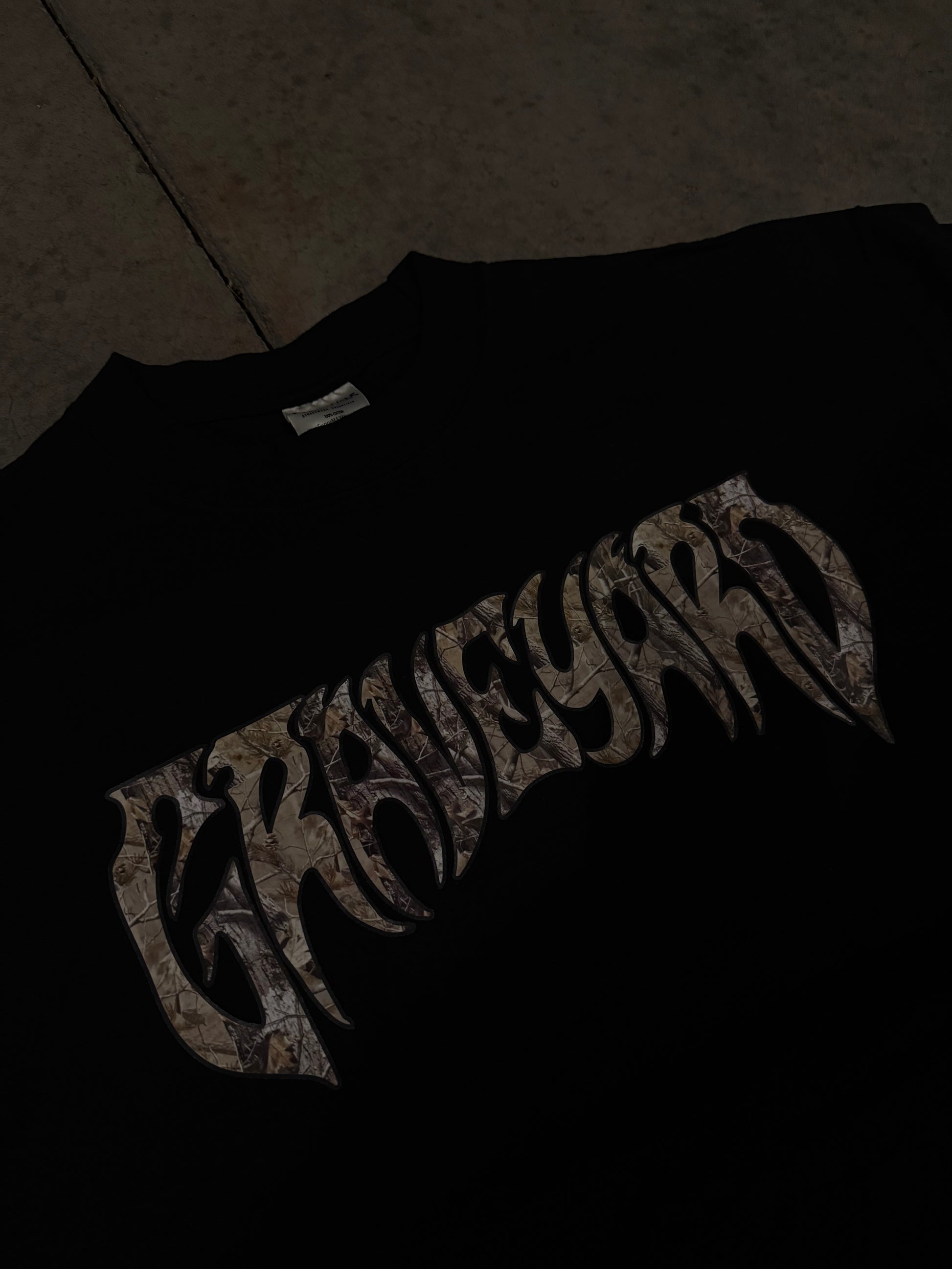 Keep it raw and heavy with the Graveyard logo tee, featuring a sharp, distressed CAMO graphic across the chest. The minimal front hit gives it a clean but aggressive look, perfect for metal-inspired streetwear.