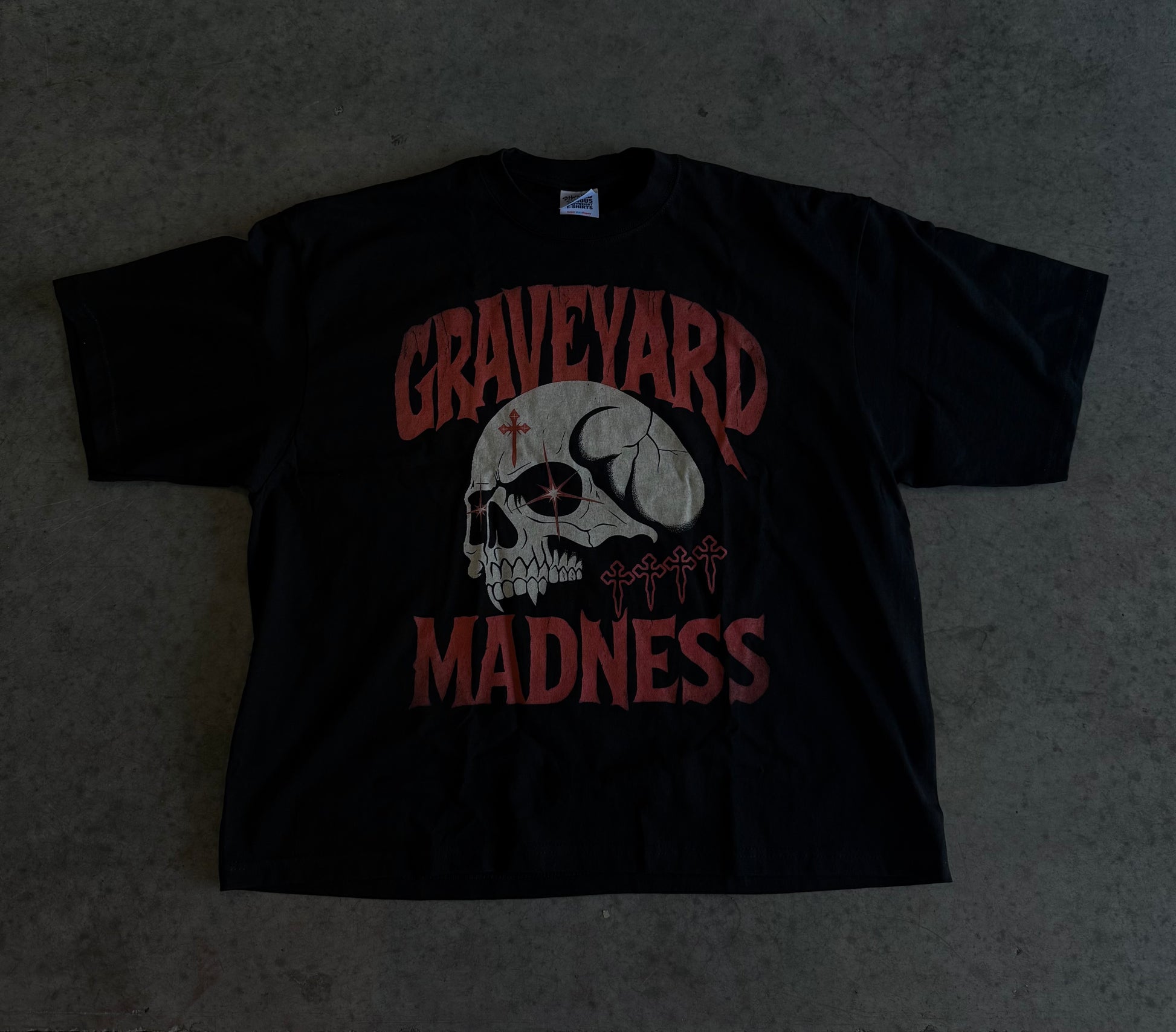 Step into the dark with the Graveyard Madness tee, featuring a bold cracked-skull graphic surrounded by blood-red lettering and cross details. The artwork delivers a raw, vintage metal aesthetic perfect for underground fashion and heavy graphic lovers.